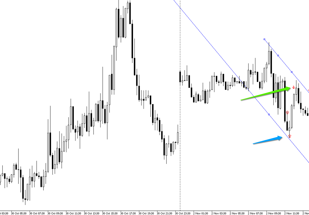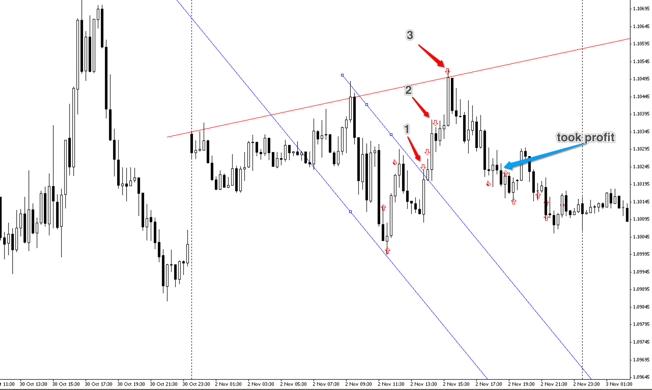 The trade came up to the top of the channel so, as planned, we shorted. We bet that the price would go down at (1). However, the price went up represented between (1) and (2). This, we considered, was an exhaustion spike so we ‘scaled in’ (added to our short) at (2). When the price zoomed up again it was clear price was going for the red line, a higher but different channel. So we shorted again at (3). We had three shorts in place at this stage. (1) was very much out of money, (2) was somewhat out of money and (3) never went out of money. We took profits at the blue arrow with break even for (1) and the others nicely in profit.