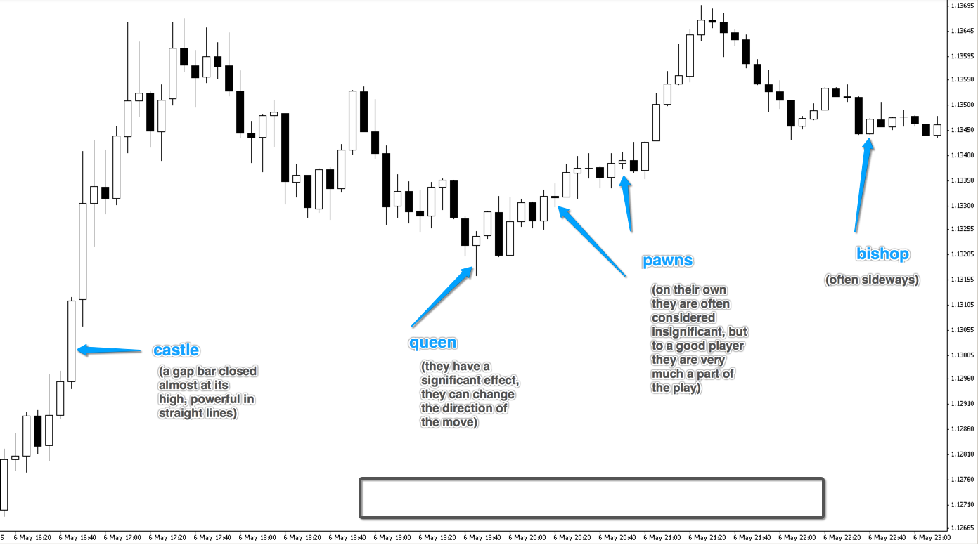 ….moreover, each trading bar has a certain characteristic, a certain force, a certain power; as do individual chess pieces – the pawn versus the queen for example. The chart below asks: are there simularities to chess?