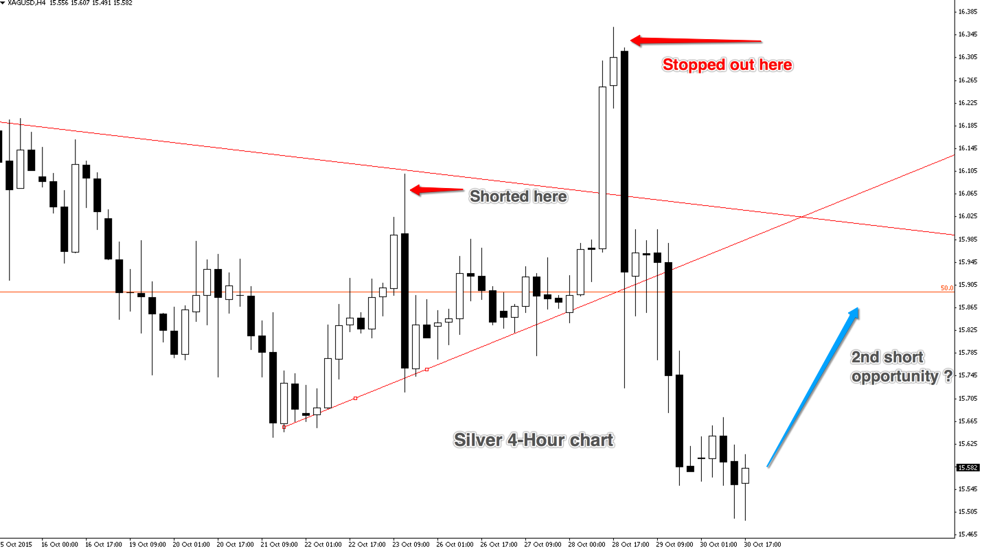 Silver. We had a good ‘short’ signal for silver. Both on the chart and the COT. The COT was a little early, so I set what I considered to be a good size stop. A stop is the exit point, the point at which we get out and accept our loss if all goes wrong. Notice on the chart below how the price climbed to almost the exact position of my stop. A stop twice this distance with a reduced trade amount was the answer. We may have a second chance if price retraces as I’ve indicated with the blue arrow.