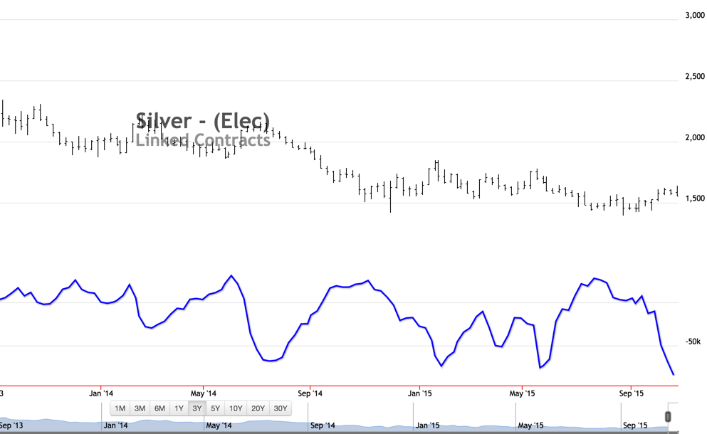 Notice the COT below for silver. It is at a 3-year low shown by the blue line. Once this turns up, and remember that the COT is big picture only, this will support a short for silver. Gold has also come down with a similar, although not quite so pronounced, COT picture.
