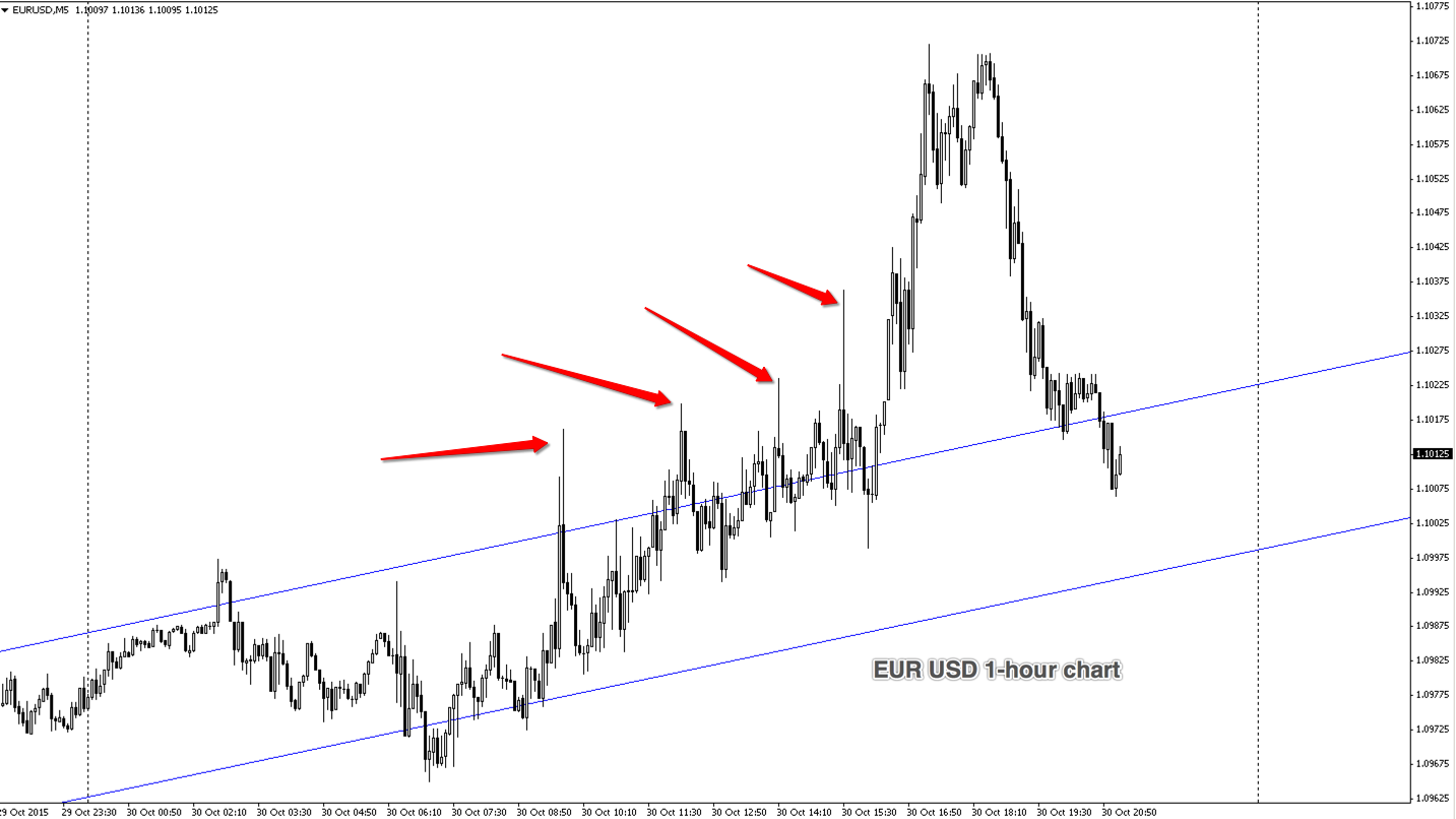 EUR USD. The currency pairing of EUR USD is one that I trade day-to-day. Notice how volatile this currency has been of late. I have provided the 1-hour chart to illustrate this by showing several recent spikes up.