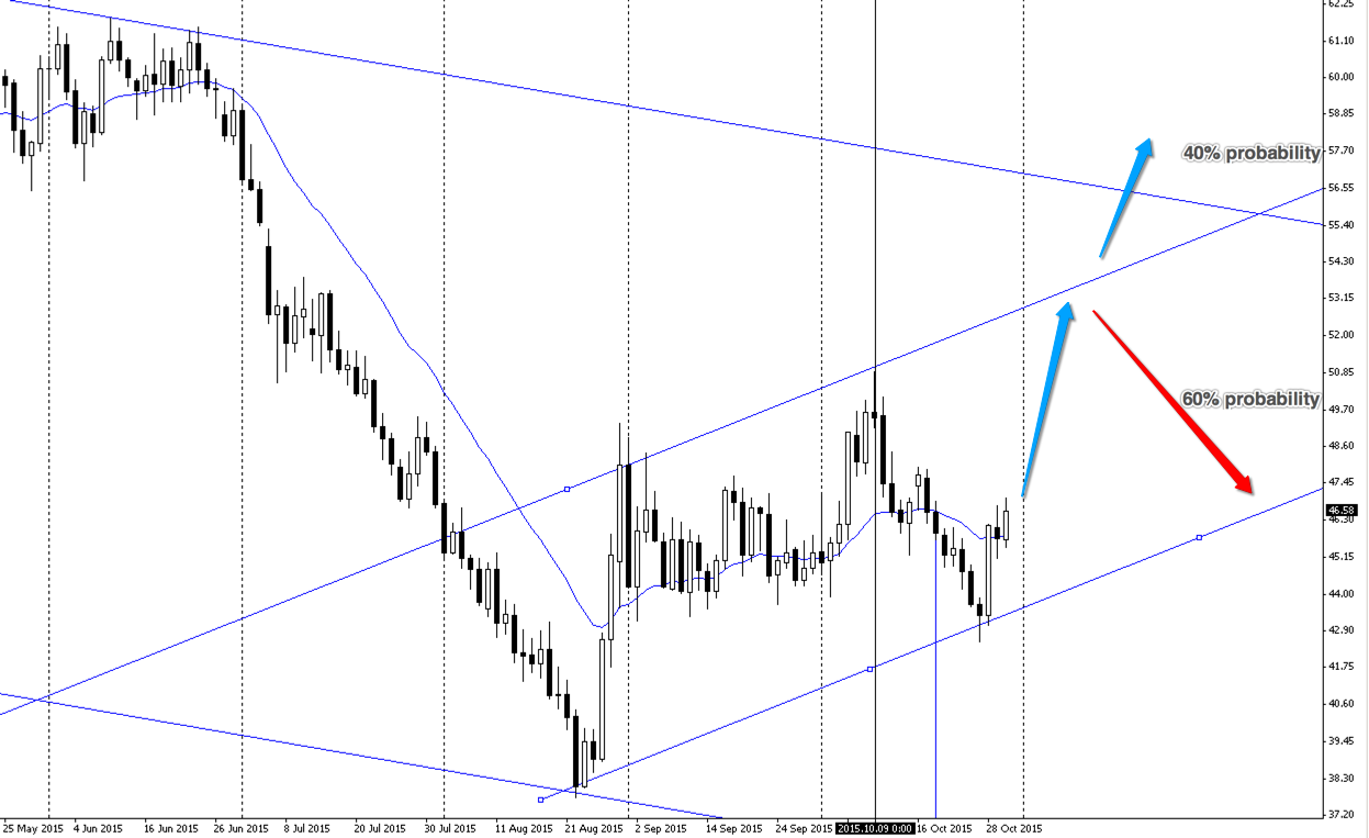 Crude Oil. A wide trading range has developed for WTI. The Price of WTI moved down to coincide with the top of the first daily breakout. An expected phenomenon . The (buy) signal, although bearish on the daily chart, was good in hindsight; however, I will look for a second entry opportunity to go long if price retraces back to the lower trend line and again provides a good buy signal. After that, I’d expect price to climb to the top of the channel that I’ve drawn with a 40% or 60% probability of ascending or descending respectively.