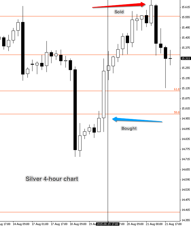 We know from the COT (commitment of traders) report that gold and silver were ready to buy. We had to be careful however of the long term trend against both of these commodities. Therefore we waited until, in this instance, silver went up and retraced to provide a buy opportunity in the direction of the COT, but also with a recent Up (a recent trend up).